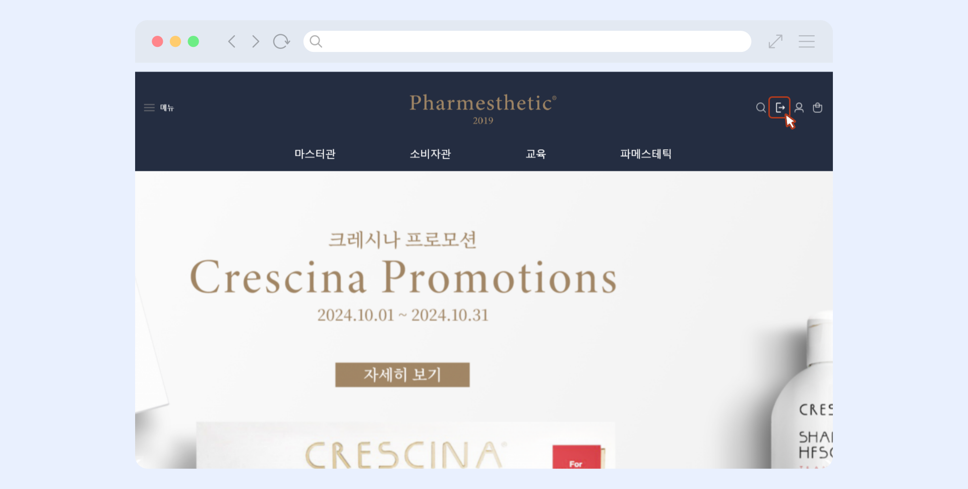 파메스테틱 공식 홈페이지(https://pharmesthetic.com/)에 접속해 오른쪽 상단의 로그아웃() 버튼을 눌러주세요.