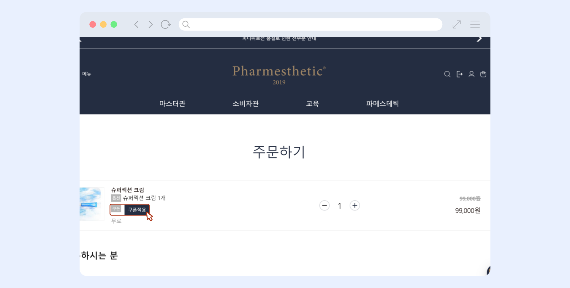 주문서 작성 시 상단에 있는 제품명 바로 밑에 쿠폰 적용 버튼을 클릭하여 쿠폰을 사용해주세요.