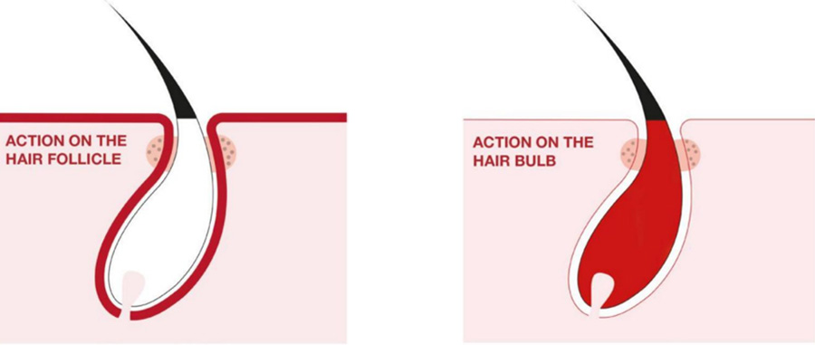(왼) 모발 벽의 탄력성이 모낭에 모발을 고정시키는 데 작용하여 모발이 조기에 빠지는 것을 막는다. 크레시나 프로텍팅(투명 바이알)은 벽의 탄력과 모낭에 대한 모근이 고정에 작용하여 모발의 조기 박리를 막는다.(오) 위축되지 않은 모발 뿌리의 모낭이 세포 분열을 하여 모발이 재성장 과정이 일어나면 모발이 굵어지고, 길어지고, 검게 된다. 크레시나 리바이탈라이징(호박색 바이알)은 생리적 모발 재생을 지원하는 비위축성 모근의 재생 과정에 작용할 수 있는 첫 번째 화장품이다.