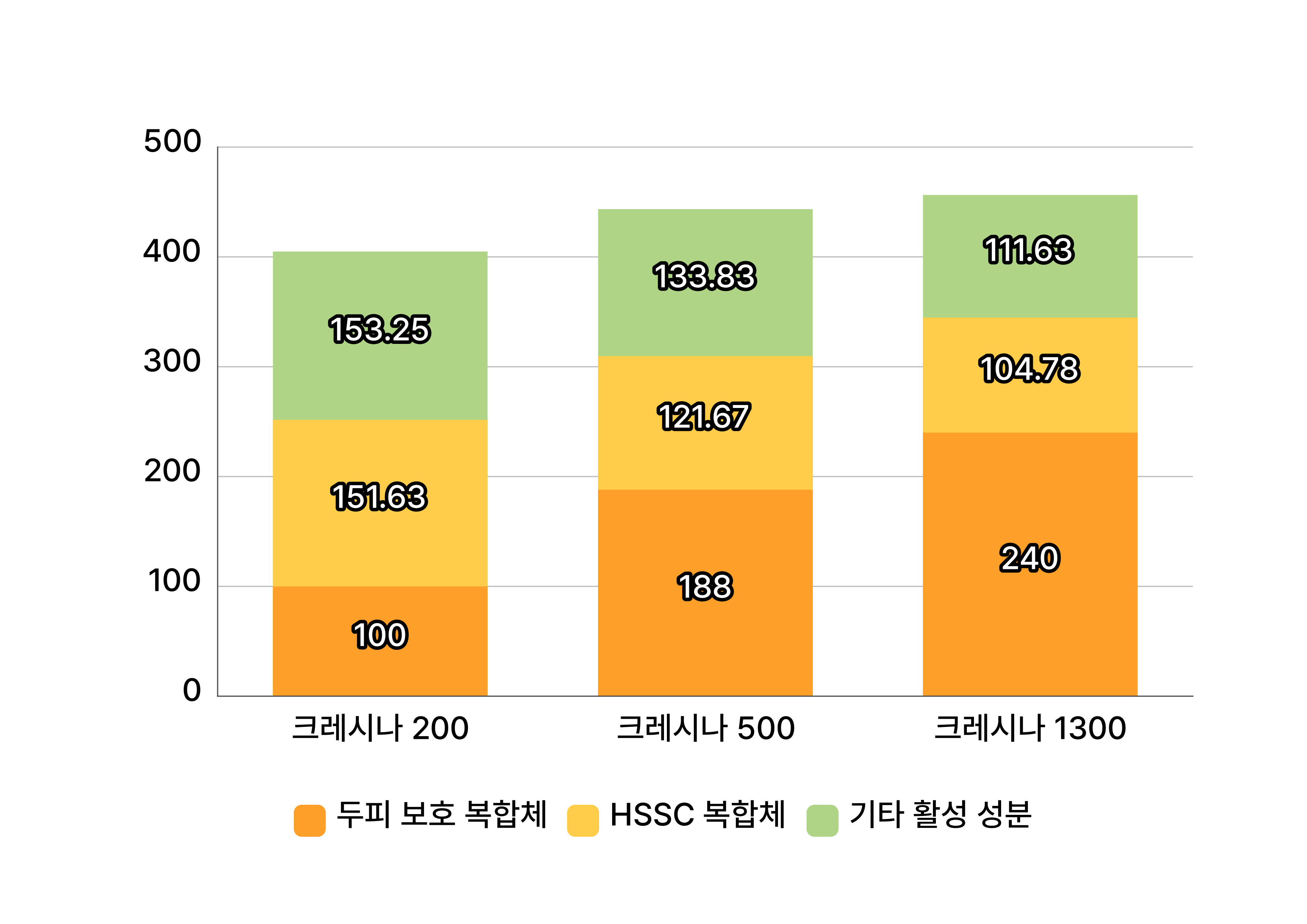 크레시나 제품명의 숫자(200, 500, 1300)는 모든 성분의 총량이 아닌 핵심 활성 성분의 농도를 기준으로 한 브랜드의 활성 지수입니다. 숫자가 클수록 특정 성분 농도가 높아 고민이 심하거나 집중 관리가 필요한 피부에 적합하게 구성된 것이며, 숫자의 크기보다는 피부 상태와 고민 정도에 맞는 제품을 선택하는 것이 중요합니다.